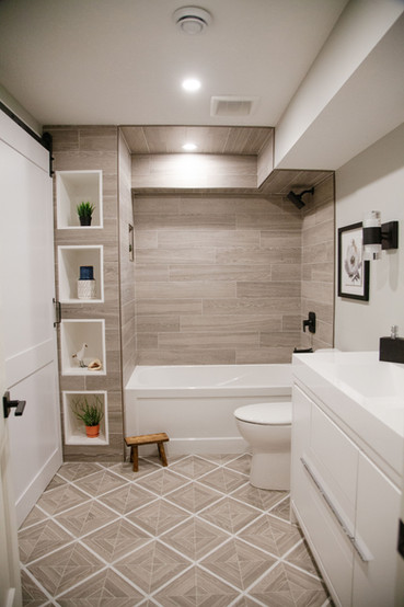 Since these clients were downsizing from a much larger home into a more compact bungalow, functional storage was a big thing to keep in mind in everything we did. In the design phase, we made strategic decisions to ensure all the spaces has functional storage top of mind. This included adding a barn door in the basement bathroom so there was still access to the under the stairs storage without it being cumbersome having a swing door in a small space. Plus I love the down-home feel that a barn door brings to a neutral colour palette space.